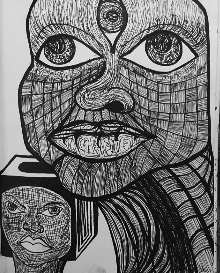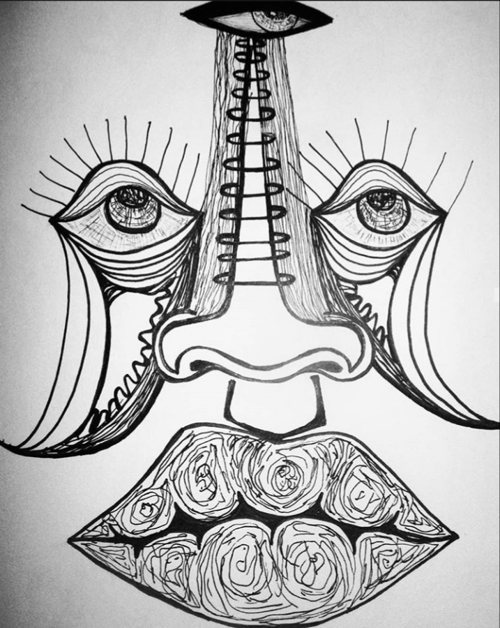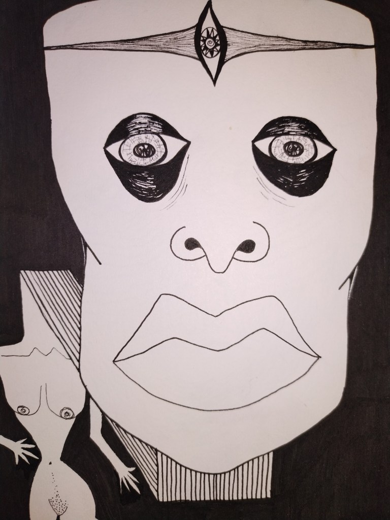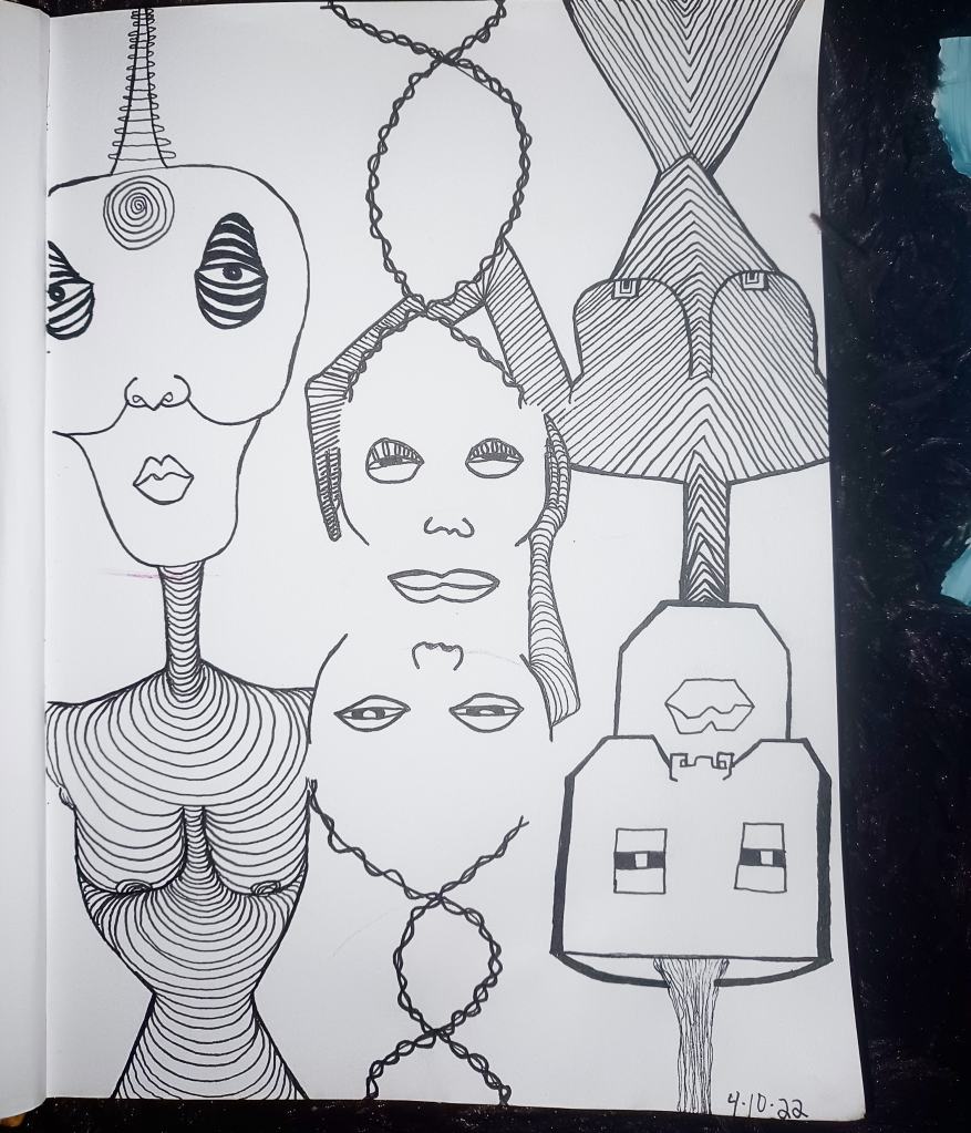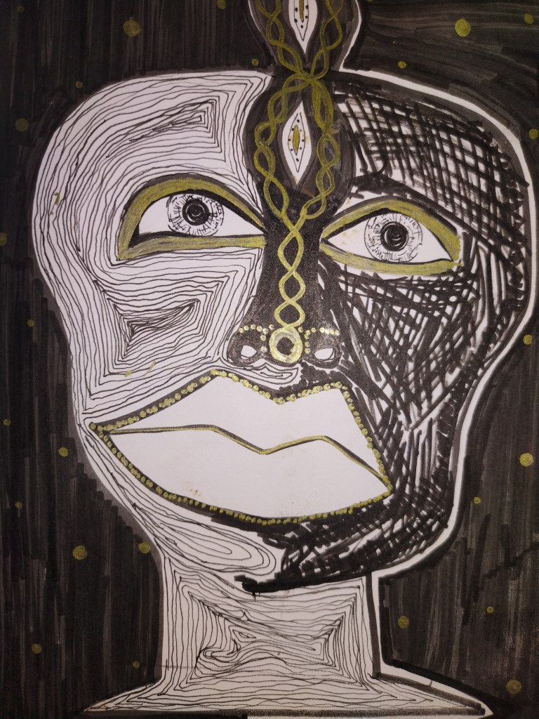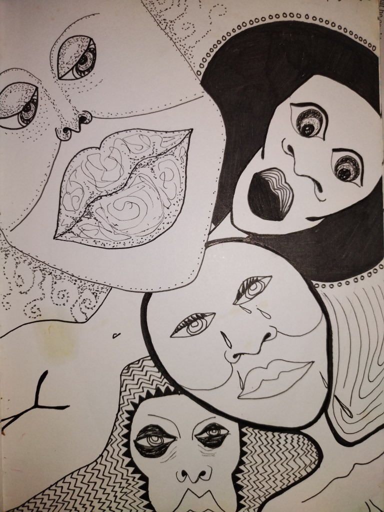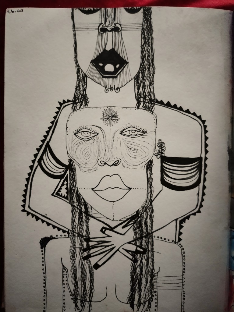 In her ink and paint work, the eyes are always born first, anchoring the piece like soul-beacons or watchers. From there, she steps aside and allows figures, fragments, and forgotten memories to emerge. There is no premeditation. Only presence.