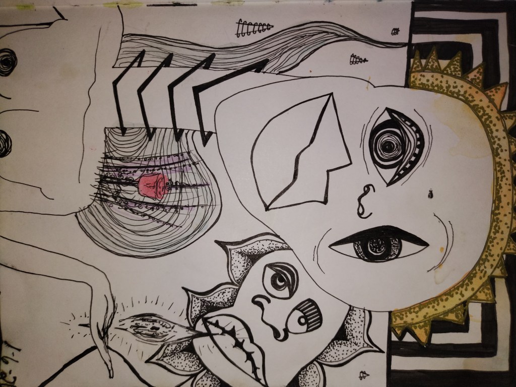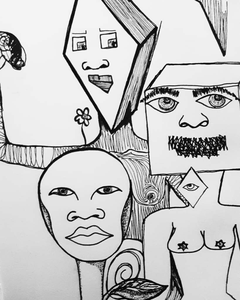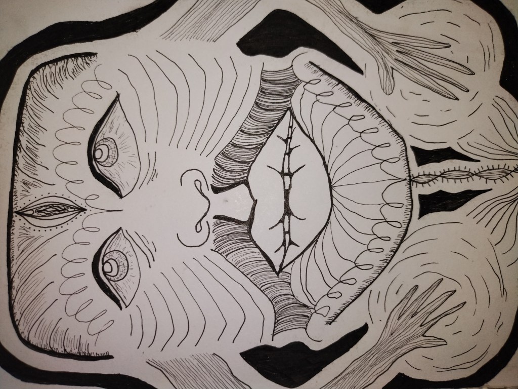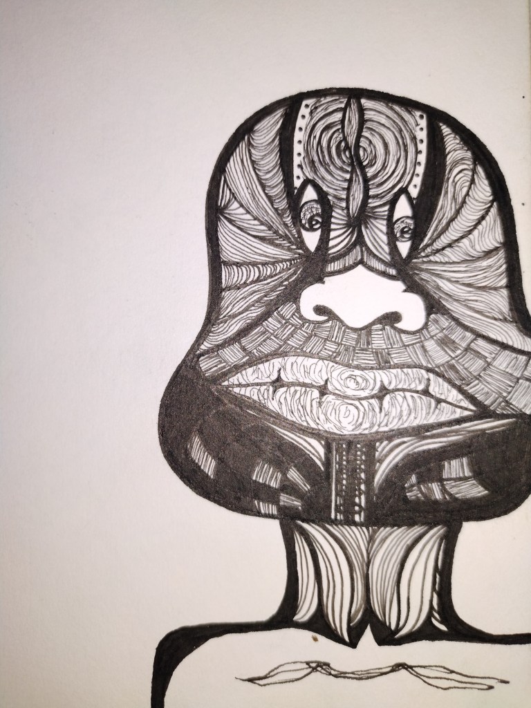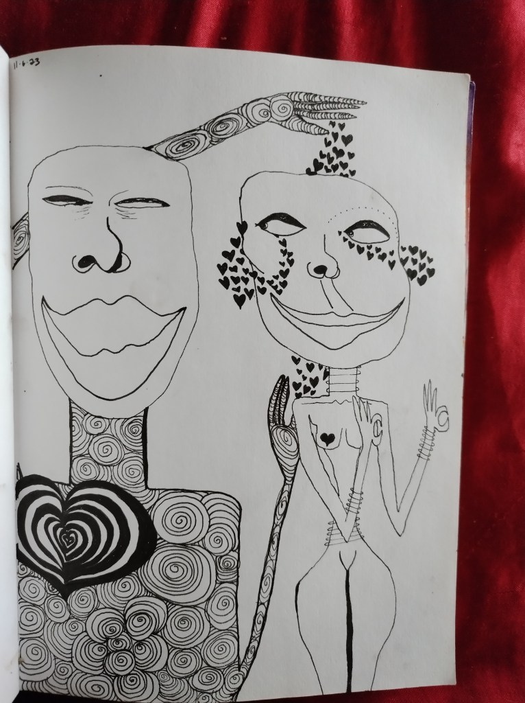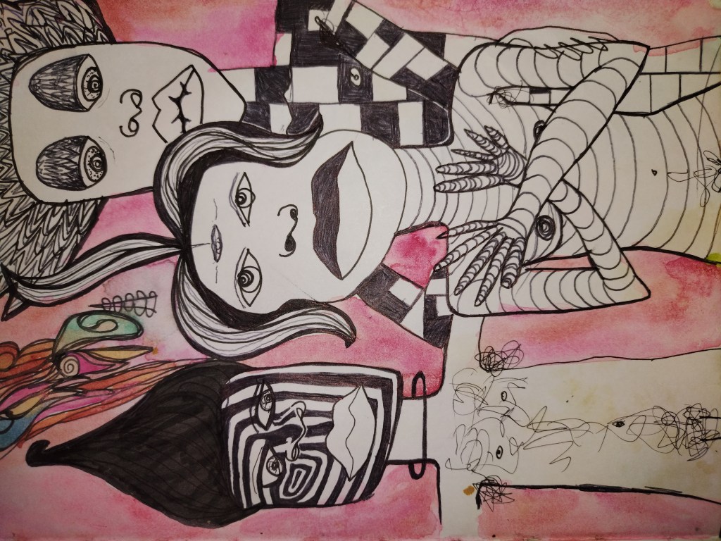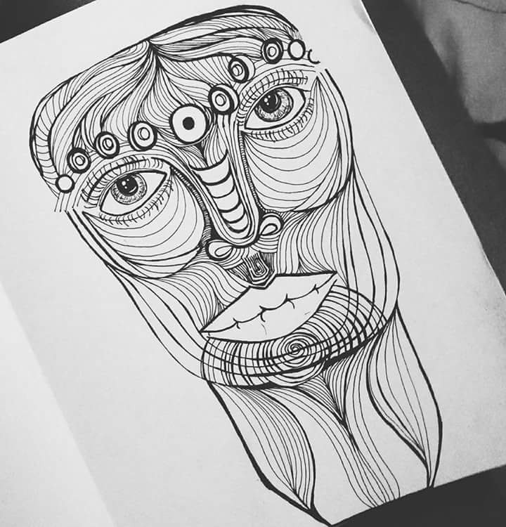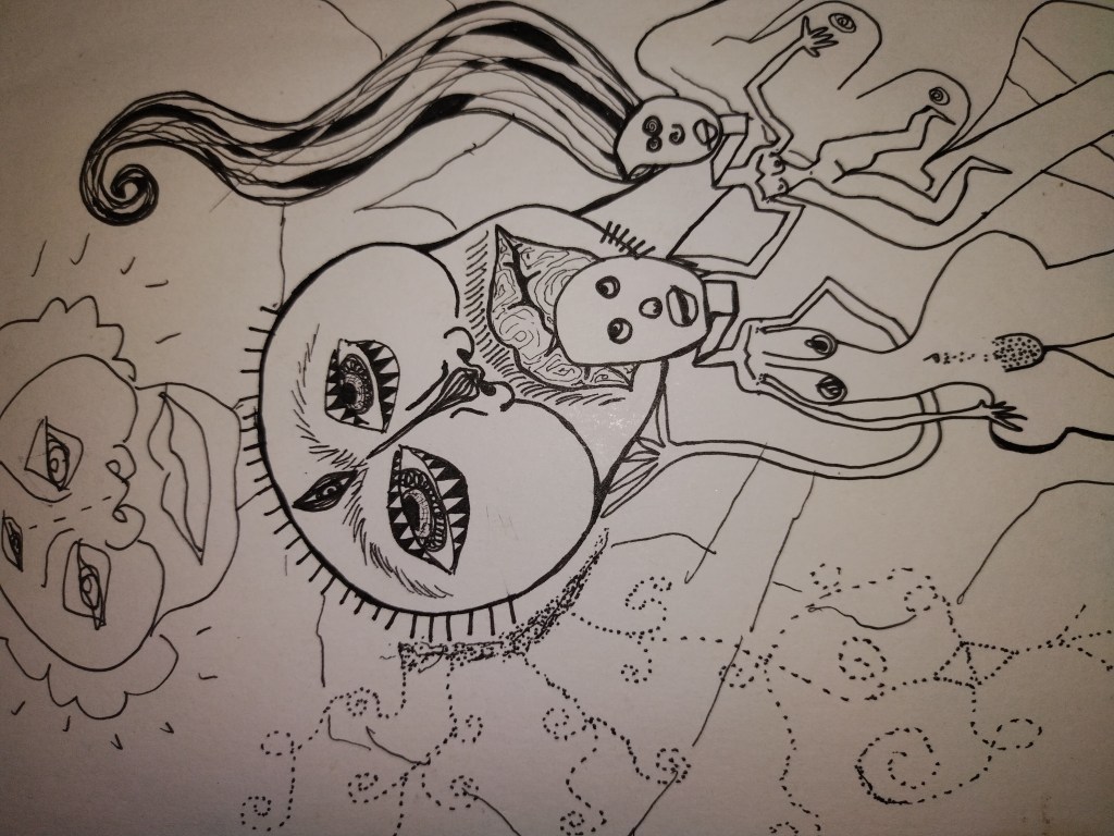 In her ink and paint work, the eyes are always born first, anchoring the piece like soul-beacons or watchers. From there, she steps aside and allows figures, fragments, and forgotten memories to emerge. There is no premeditation. Only presence.