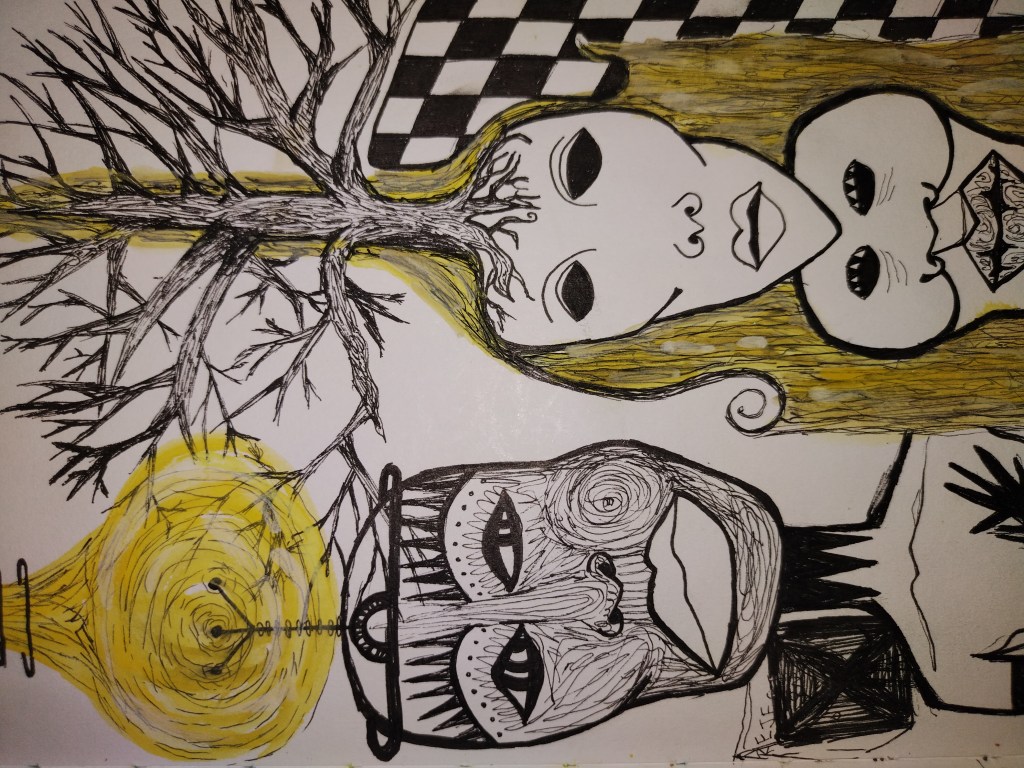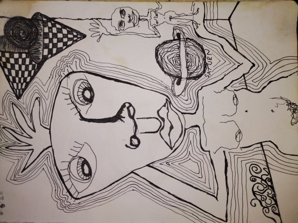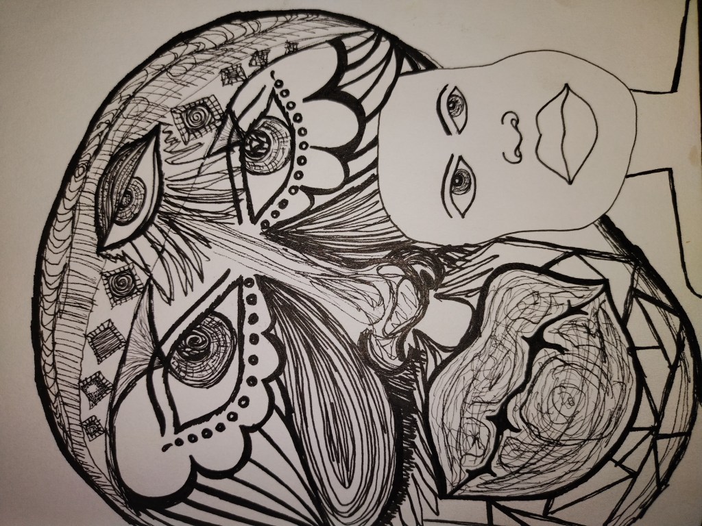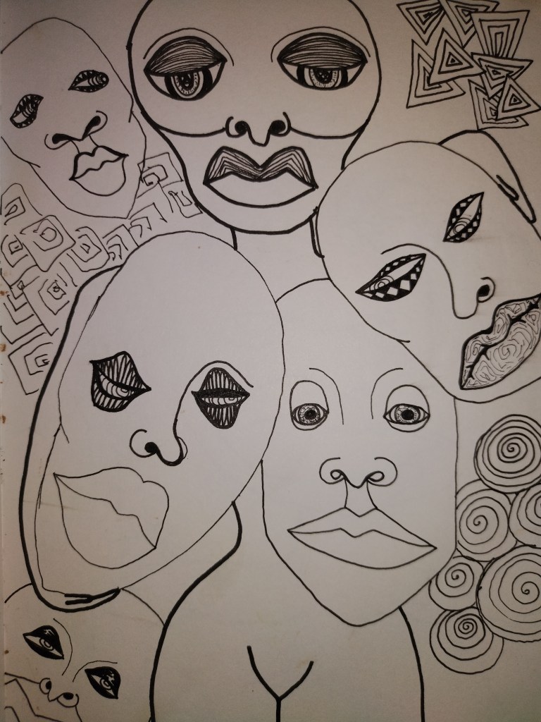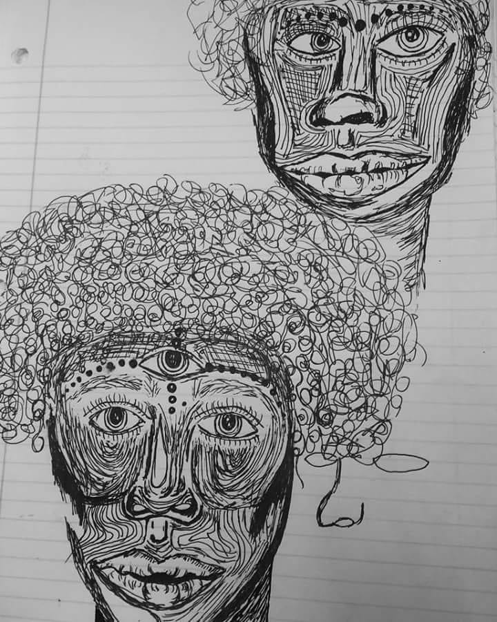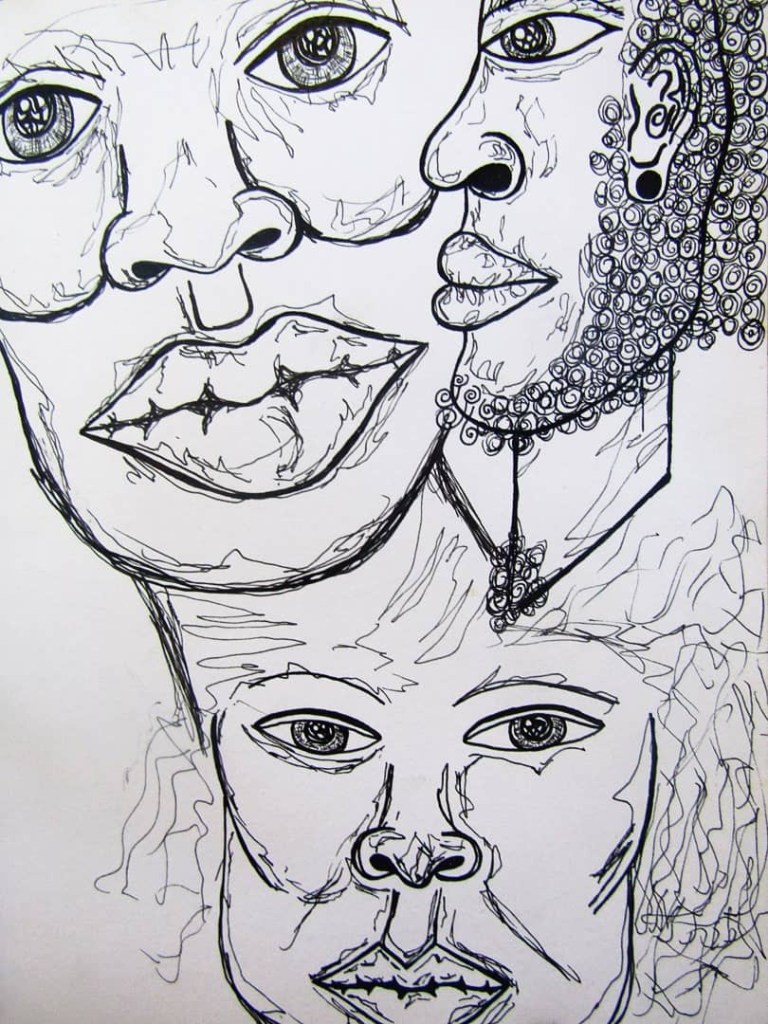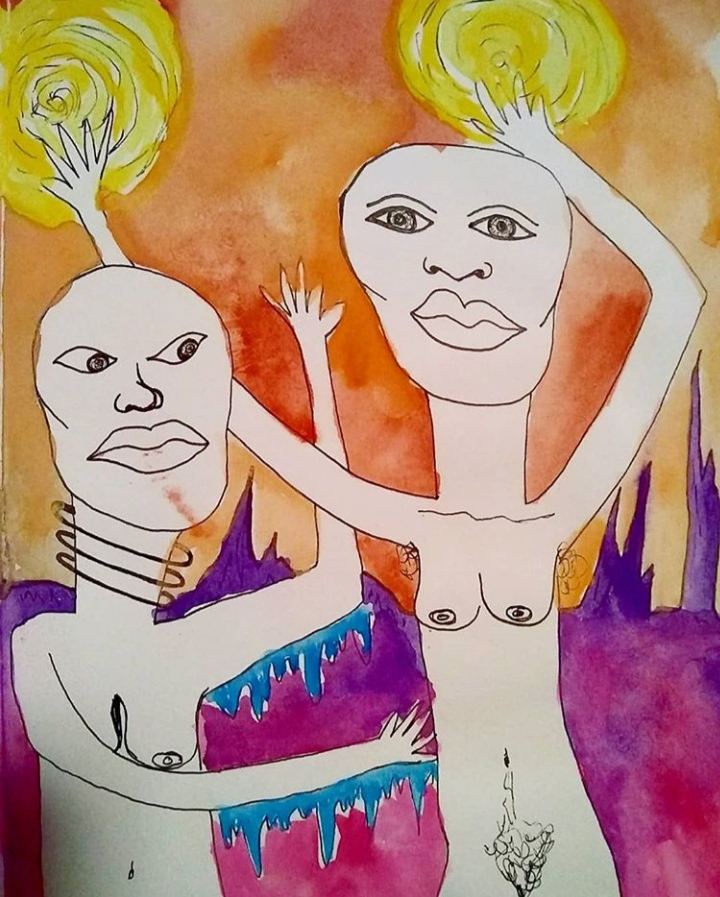 In her ink and paint work, the eyes are always born first, anchoring the piece like soul-beacons or watchers. From there, she steps aside and allows figures, fragments, and forgotten memories to emerge. There is no premeditation. Only presence.