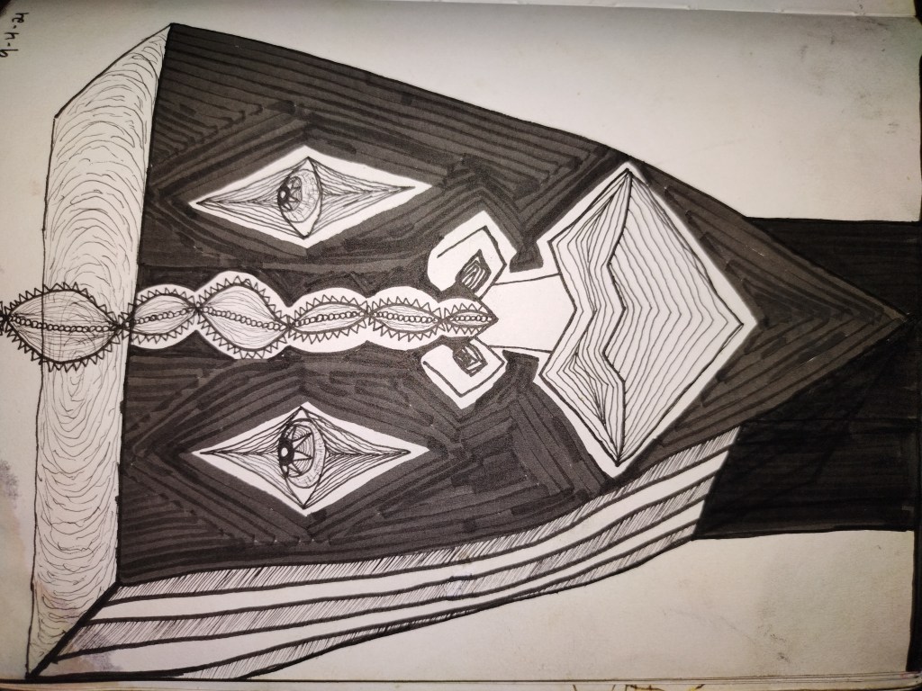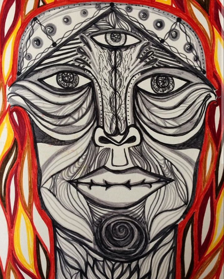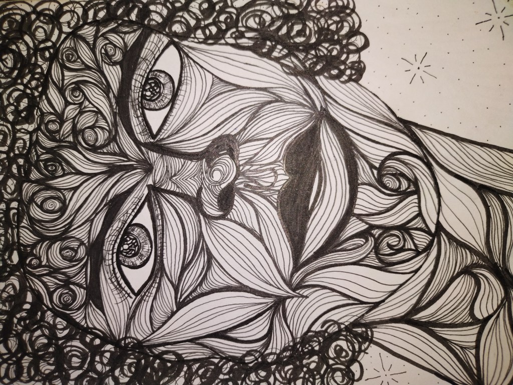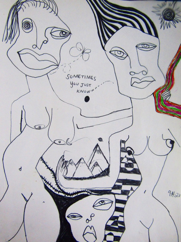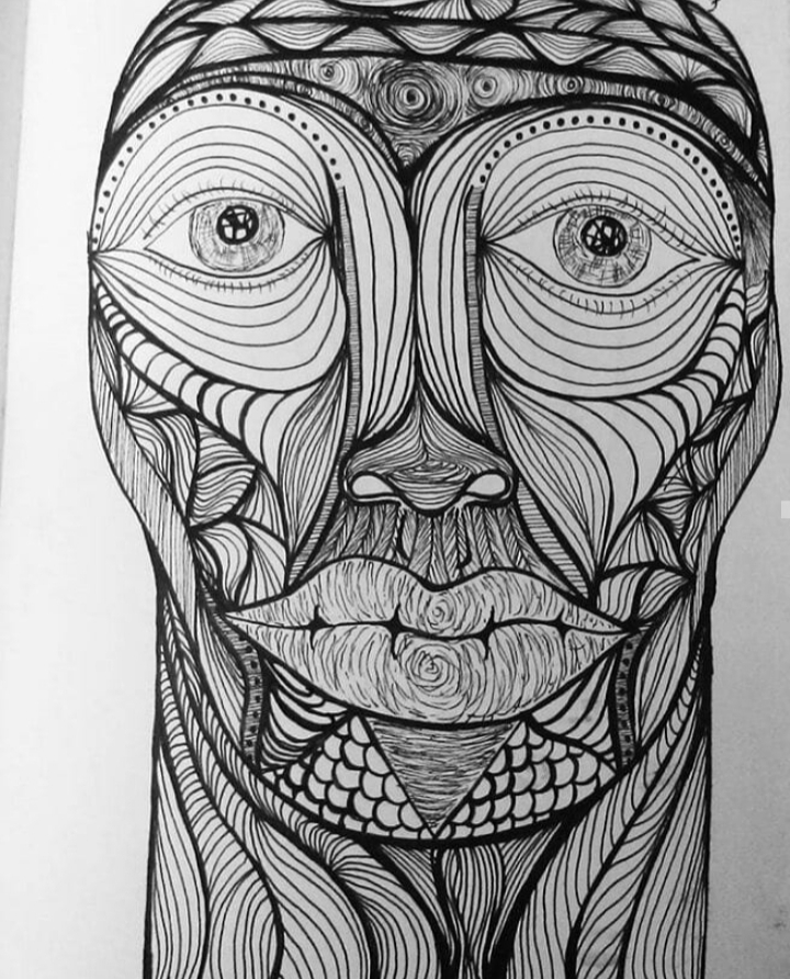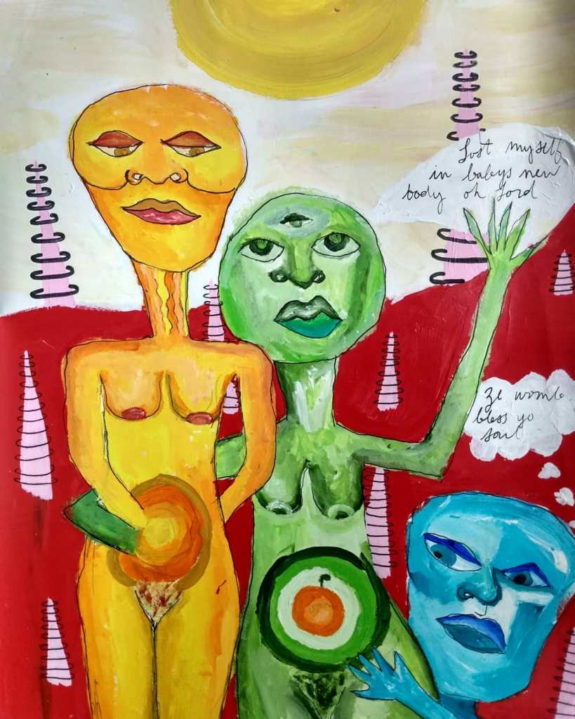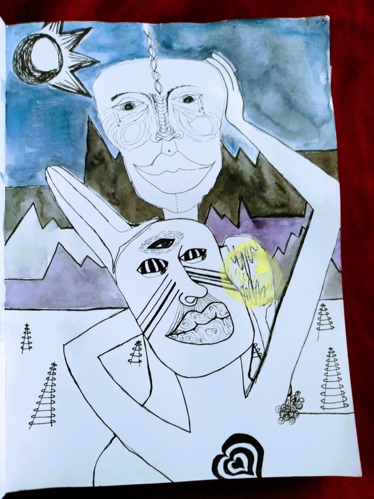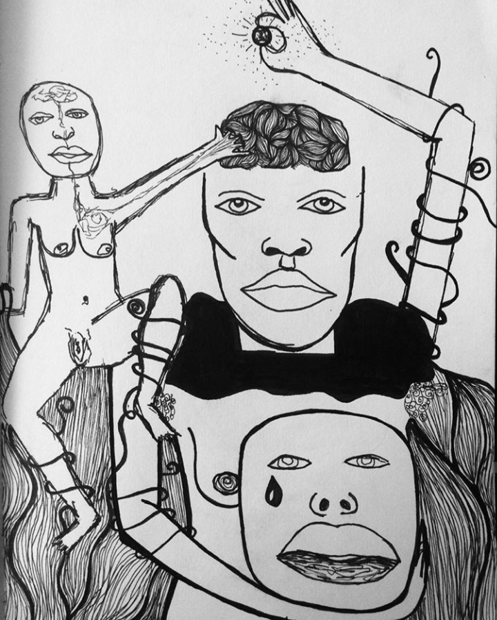 In her ink and paint work, the eyes are always born first, anchoring the piece like soul-beacons or watchers. From there, she steps aside and allows figures, fragments, and forgotten memories to emerge. There is no premeditation. Only presence.