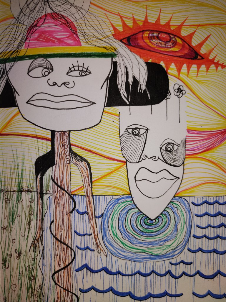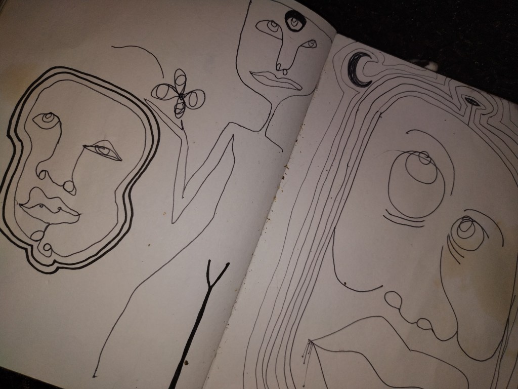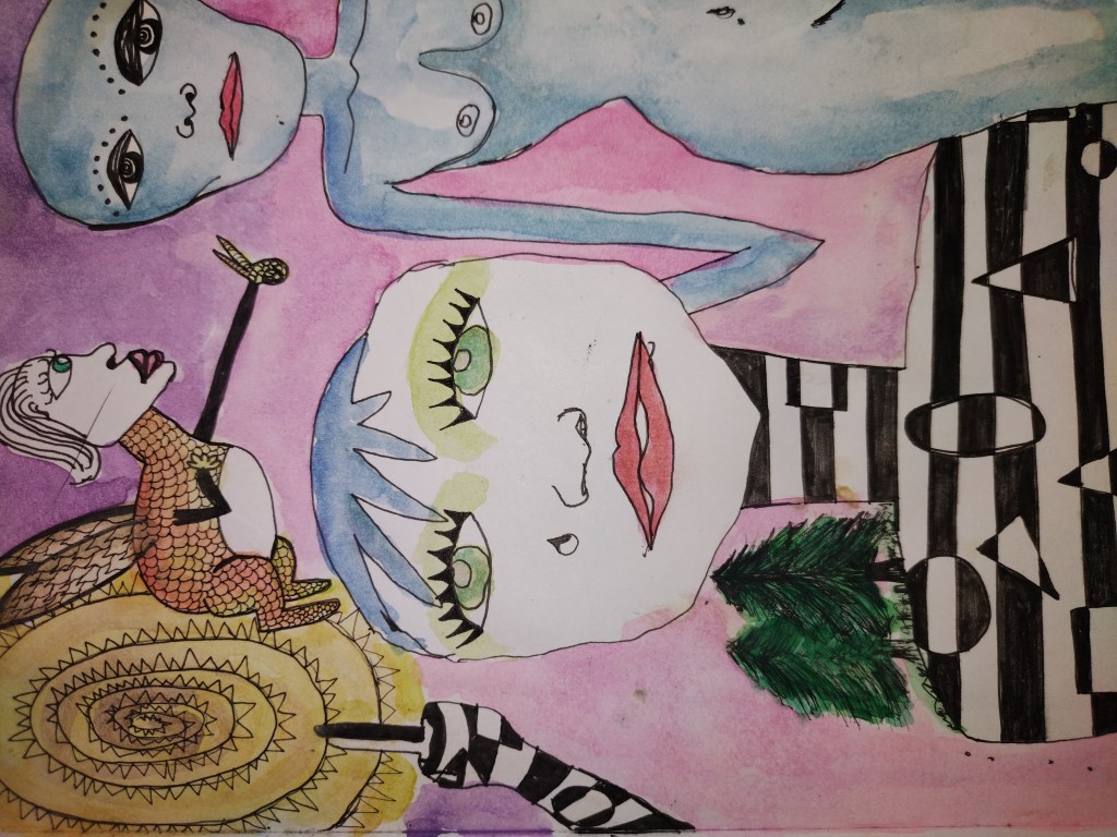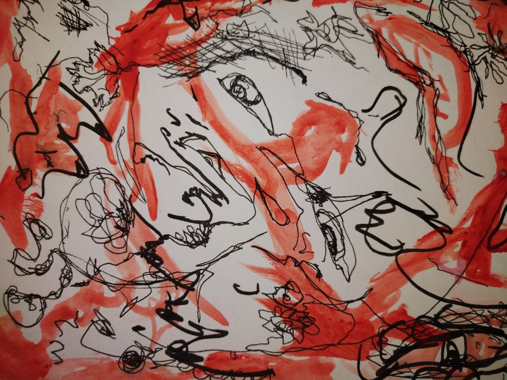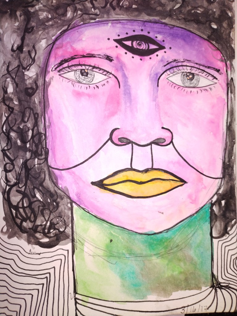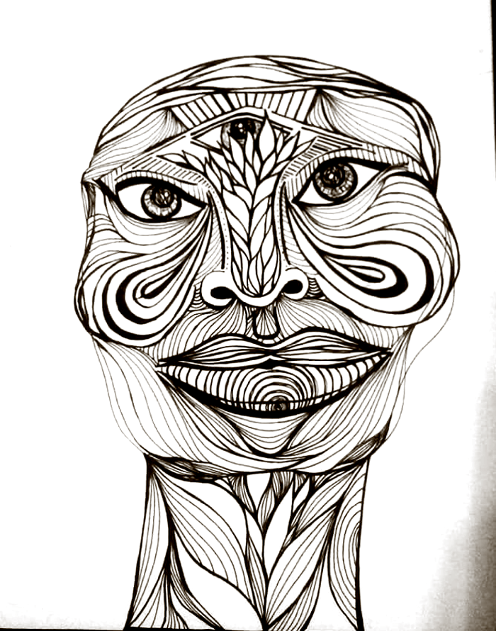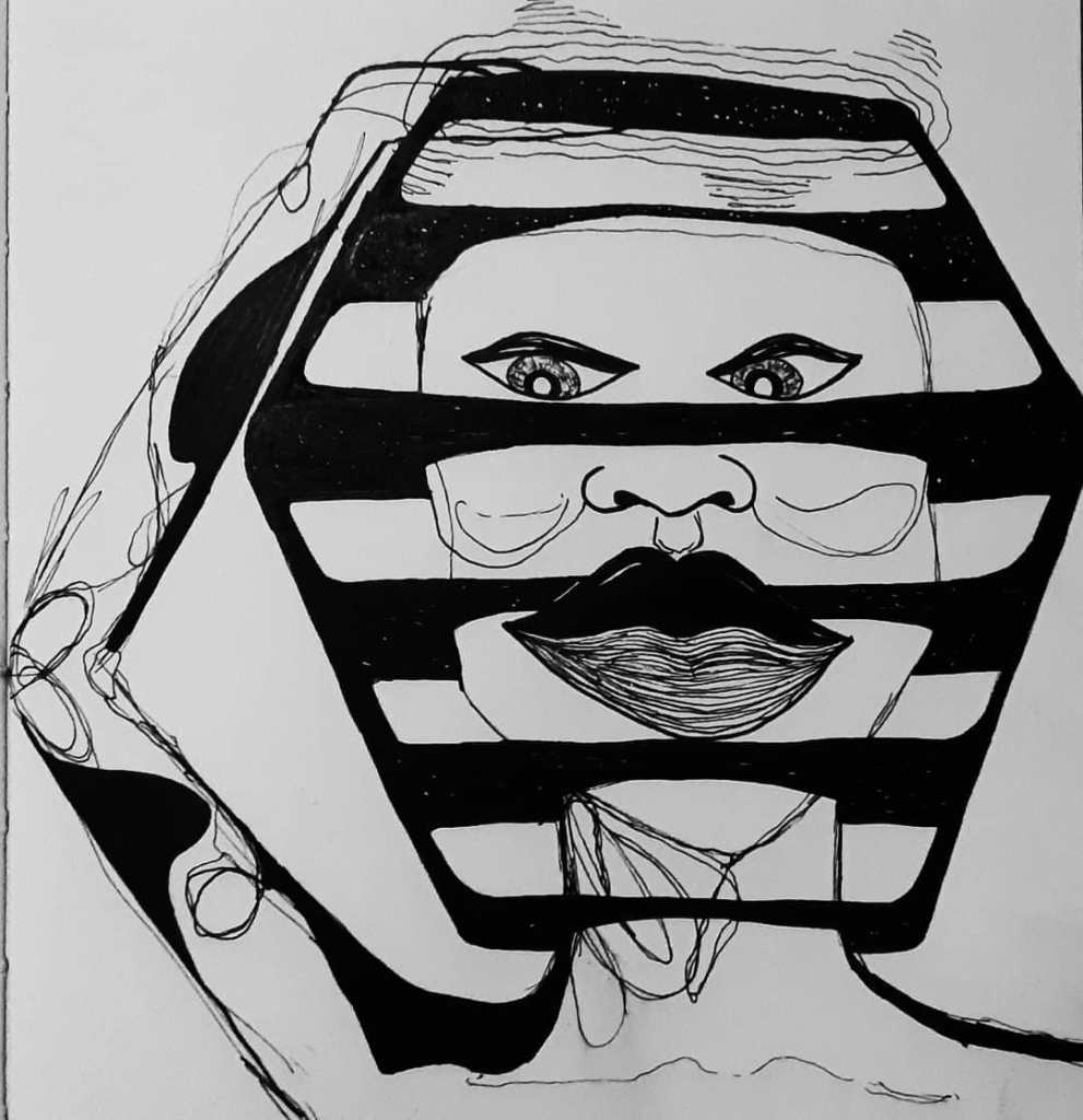 In her ink and paint work, the eyes are always born first, anchoring the piece like soul-beacons or watchers. From there, she steps aside and allows figures, fragments, and forgotten memories to emerge. There is no premeditation. Only presence.