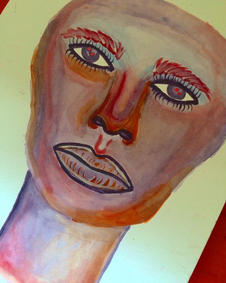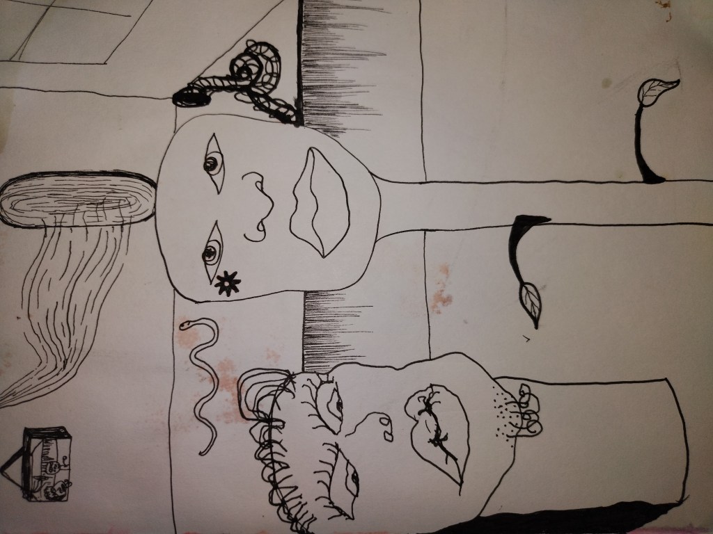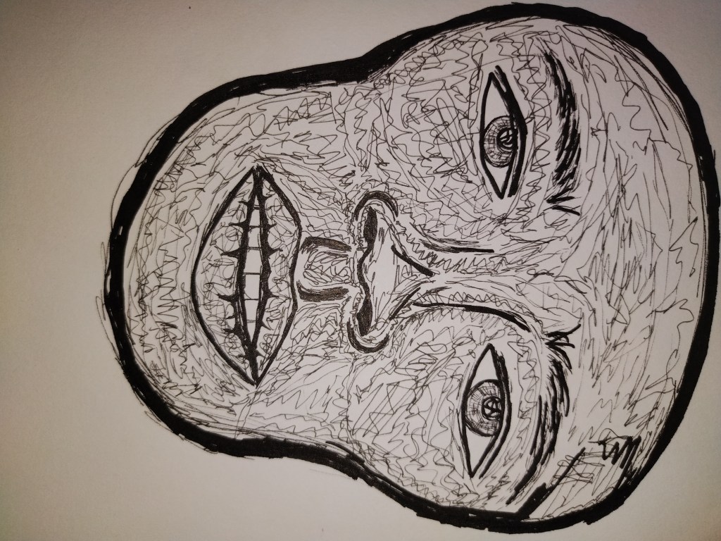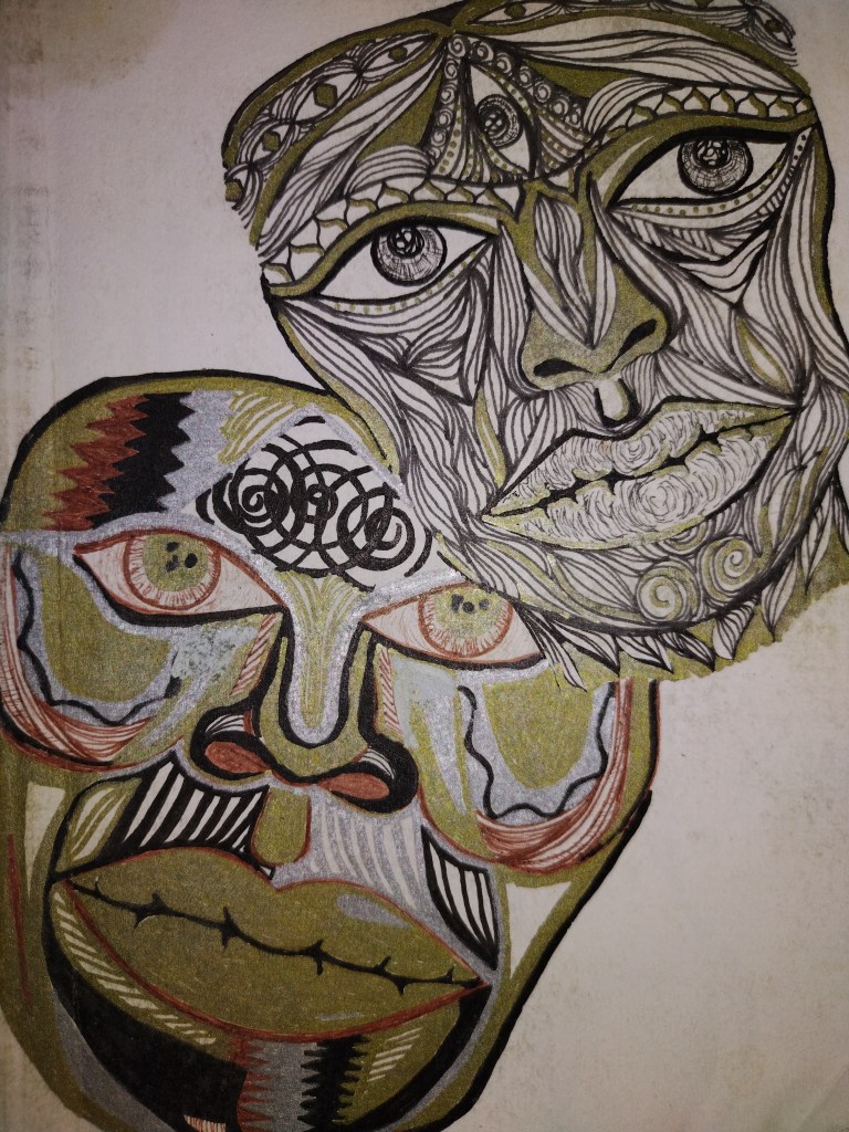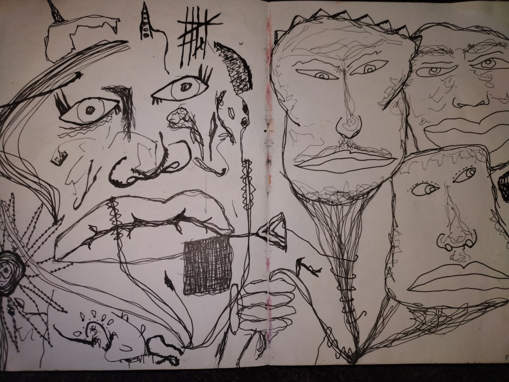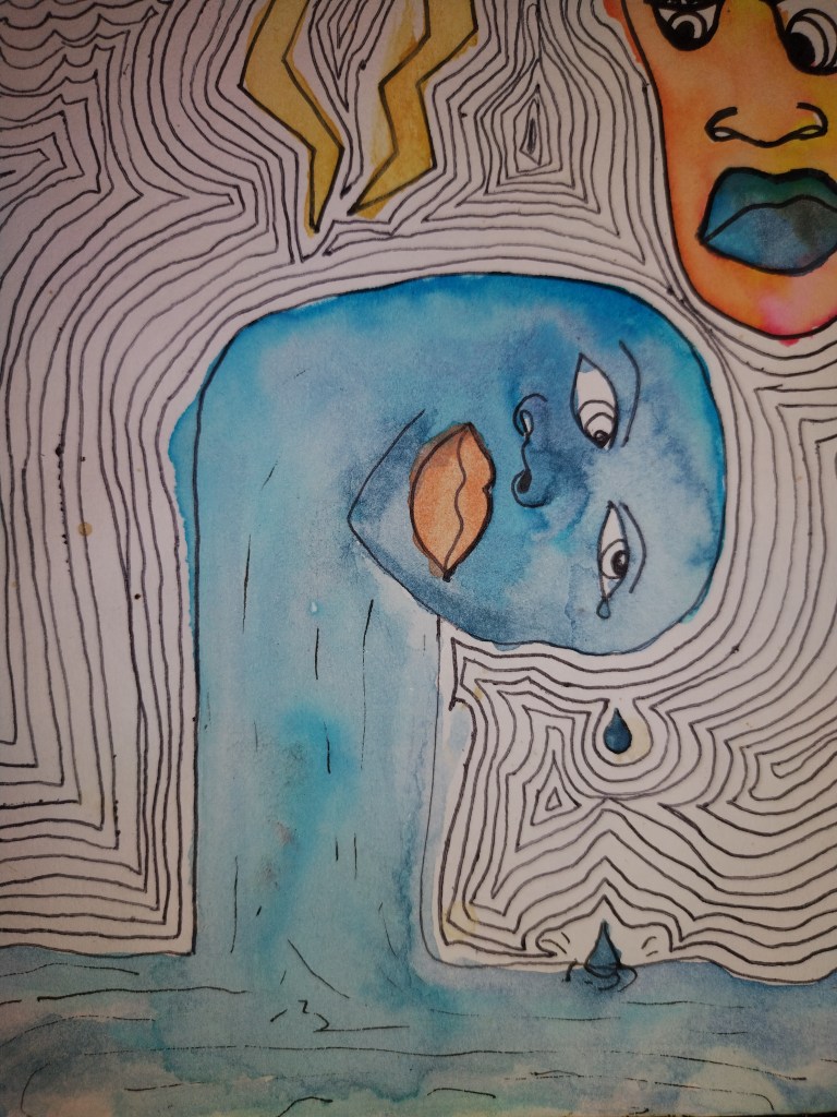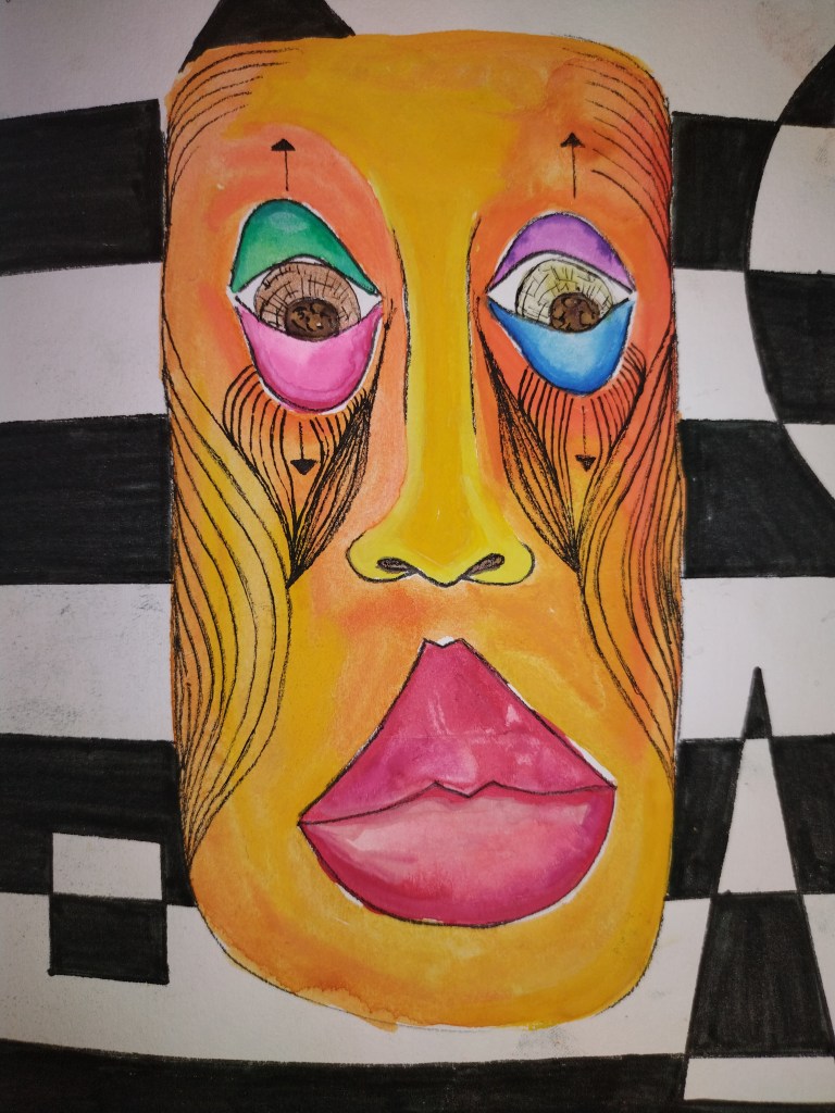 In her ink and paint work, the eyes are always born first, anchoring the piece like soul-beacons or watchers. From there, she steps aside and allows figures, fragments, and forgotten memories to emerge. There is no premeditation. Only presence.
